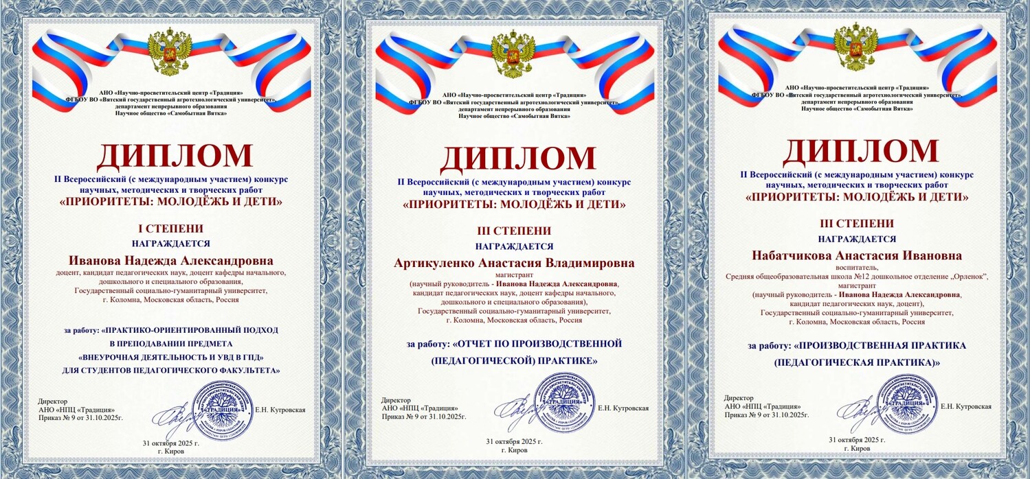 Подведены итоги II Всероссийского конкурса научных, методических, творческих работ «ПРИОРИТЕТЫ: МОЛОДЁЖЬ И ДЕТИ», организованного АНО «Научно-просветительским центром «Традиция» и ФГБОУ «Вятским государственным агротехнологическим университетом» (г.Киров).